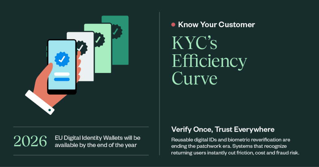 For years, Know Your Customer (KYC) has been built on repetition: verify, approve, repeat. But in 2026, deepfakes, synthetic identities and AI-generated documents are overwhelming legacy verification systems, all while customers are demanding faster, frictionless onboarding. The result is a widening KYC gap between risk and user experience. The key to closing that gap in 2026? Efficiency, powered by the combination of reverification and reusable identity. Together, they signal the end of the patchwork era in identity verification and the rise of unified, orchestrated trust. Reusable Identity: Portable Proof for a Faster World The first major shift is the rise of reusable identity – government-backed digital credentials that eliminate the need to restart verification from zero. Instead of re-uploading documents or repeating data entry, users present a portable, cryptographically secure identity that can be trusted across platforms and jurisdictions. This trend is accelerating quickly: The EU will issue Digital Identity Wallets to all citizens and businesses by the end of 2026. In the U.S., mobile driver’s licenses (mDLs) are expanding and already accepted at more than 250 TSA checkpoints. But reusable identity doesn’t stand alone. Its power is amplified by biometrics. When paired with AI-driven facial verification and liveness detection, these digital credentials become even harder to simulate. Biometrics confirm that the person presenting the credential is the legitimate holder, detecting subtle inconsistencies that synthetic media struggles to replicate. Reusable identity solves one of KYC’s core inefficiencies: unnecessary friction for legitimate users. It delivers the speed customers expect without sacrificing the security regulators require. Reverification: Trust That Refreshes Automatically If reusable identity accelerates onboarding, reverification ensures that identity remains trustworthy over time. It shifts verification from a one-time event to a continuous, adaptive signal. Reverification uses advanced biometrics and behavioral checks to confirm that a returning user still matches the identity previously verified. This approach is crucial as fraud tactics evolve – especially deepfakes and synthetic identities that can bypass traditional document checks. Just as important, reverification spares genuine customers from repeating the entire KYC process. The system recognizes them instantly, while exposing returning fraudsters before they reenter the funnel. Reverification strengthens assurance while lightening the customer experience – a combination legacy that KYC workflows were never built to deliver. Efficiency Through Orchestration If reusable identity and reverification are two individual cogs in the machine of KYC, then efficiency is what happens when they lock together, generating momentum neither could produce on its own. Reusable identity removes redundant steps for users who have already proven themselves, while reverification keeps that identity accurate over time. Combined in a single, orchestrated flow, they allow businesses to recognize returning customers instantly, expose repeat fraudsters before they reenter the funnel and reduce the operational cost of manual review. Efficiency becomes the new strategy for both growth and risk mitigation. What You Can Do Now Organizations preparing for this shift are prioritizing three foundational moves: Reducing document-heavy checkpoints, where friction and AI-driven fraud risk are highest Incorporating “known faces” logic into orchestration to accelerate trusted users and flag repeat offenders Laying the groundwork for eID and mDL integration, ensuring readiness for the rise of reusable identity Each of these steps strengthen both efficiency and trust – the two qualities that will define competitive KYC in 2026. The Path Forward Efficiency is defining the future of KYC. Reusable identity cuts out redundant checks while reverification keeps identity signals fresh, adaptive and harder for fraud to exploit. Together, they create an orchestration layer that reduces cost and complexity while improving assurance across every channel. In 2026, knowing your customer means doing less manual verification, making fewer requests – and trusting more of what the system already knows. Industry Report Five Trends Reshaping Digital Identity in 2026 Explore how agentic commerce, sophisticated fraud and dynamic verification technology are driving the trends shaping digital identity in the coming year. Download the report Solutions Regulatory Compliance Optimize Identity Verification for Regulatory Compliance Resources Library Know Your Customer (KYC) White Papers Build Trust and Safety With Digital KYC View All KYC Featured Blog Posts Individual Verification (KYC) KYC: 3 Steps to Achieving Know Your Customer Compliance AML AML Compliance Checklist: Best Practices for Anti-Money Laundering Business Verification (KYB) Enhanced Due Diligence (EDD): A Comprehensive Guide AML Sanctions and PEP Screening: A Critical Step in the KYC Process Identity Verification Proof of Address — Quickly and Accurately Verify Addresses Individual Verification (KYC) Top 10 Questions About Beneficial Ownership for AML/KYC Compliance Business Verification (KYB) How to Verify Legitimate Businesses and Merchants Individual Verification (KYC) Customer Due Diligence Checklist — Five Steps to Improve Your CDD